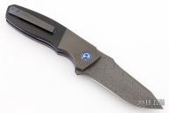 This Phoenix Flipper by Kirby Lambert features a Chad Nichols stainless Damascus blade with notched thumbrest and flipper. The handle has zirconium bolsters, black Westinghouse paper micarta scales, textured and anodize finished titanium liners, matching westinghouse backspacer, and a tip up zirconium clip, anodized titanium hardware and mokuti pivot collars. Nice detent, lockup and blade seating, rides on bearings. Comes with nylon zippered case and sticker. New from maker!