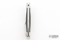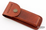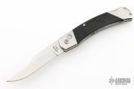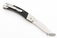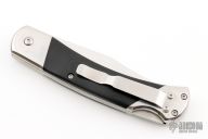 This button lock auto by Bear and Son features a polished blade with false top edge. The handle has a stainless steel frame with black G-10 inlays, tip up stainless steel clip. Comes with brown leather sheath, original box and papers. Excellent condition.
