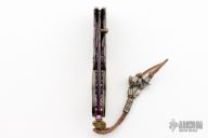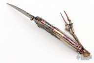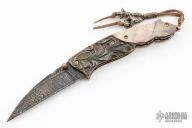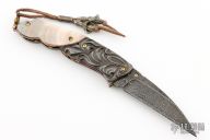 This knife by Suchat Jangtanong features an Alabama Damascus blade with a single black lip pearl inlaid thumbstud and fileworked blade spine. The handle has carved Alabama Damascus bolsters, black lip pearl scales, fileworked and anodized titanium liners and backspacer with gold and black lip pearl inlays, gold plated screws. Comes with zippered case and COA dated August 15, 2011. Nice detent, lockup and blade seating. Very impressive work. Excellent condition.