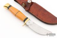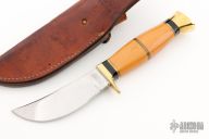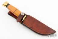 This Model SO by Ralph Bone features a mirror finished blade with notched thumbrest, .240" blade stock and 1.184" blade depth, hidden tang construction. The handle is comprised of brass guard and butt, black and brass spacers, yellow paper micarta grip. #101 on the blade. Comes with brown leather sheath. Has some light patina, otherwise excellent condition.