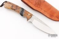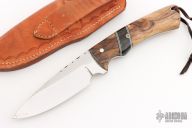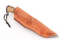 This hunter by RA Matt features a mirror polished blade with fileworked spine, .178" blade thickness and 1.367" blade depth, full tapered tang construction. The handle has maple bolsters and maple scales with black liners, fileworked tang spine. Comes with a hand tooled brown leather sheath. Has some light oxidation spots, otherwise good condition.
