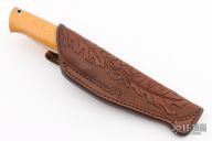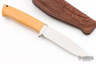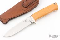 This Hunter by Robert Hajovsky of "Bob Sky" knives features a mirror polished drop point blade with .214" blade stock and 1.074" blade depth, full tapered tang construction. The handle has a nickel silver guard with yellow paper micarta scales over black liners. Lanayrd tube in pommel. Comes with a hand tooled brown leather sheath. Has one small oxidation spot near the tip, otherwise excellent condition.