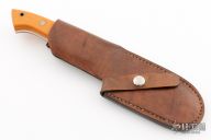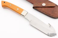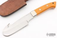 This Skinner by Bob Schultz features a hand rub satin finished blade with gut-hook and notched thumbrest, .242" blade stock and 2.010" blade depth, full tapered tang construction. The handle has dovetailed nickel silver bolsters, yellow linen micarta scales. Comes with a brown leather sheath. Excellent condition.