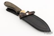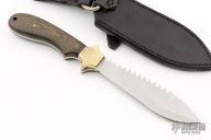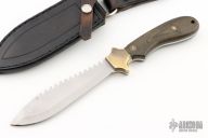 This knife by R.D. Miller features a bead blasted blade with false top edge and sawteeth on the spine, .136" blade stock and 1.293" blade depth, full tang construction. The handle has brass bolsters, black linen micarta scales. Comes with a black leather sheath. Has a couple light scuffs, otherwise excellent condition.