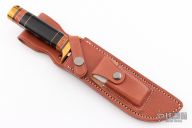 The Hattori SAN-31 Limited Bowie Knife is modelled after a famous S.O.G. knife from the Vietnam war era and has a 6-1/4" hollow ground, semi-mirror polished V-Gold San-Mai stainless steel Bowie-style blade, with a large false edge on the back of the clip point. Elegant and simple, the 4-3/4" "STAY-GOLD Edition" Custom Combination Handle is a real modern beauty (Leather Washer / Brass / Quince Burl Wood / Black Micarta) that features a solid Brass Double Guard / Crossguard and Butt Cap (With Lanyard hole). The knife comes with a Brown leather sheath (With a sharpening stone inside the pocket) and the Gift box has a special Sanjyu ("80-year anniversary") gold label and message.