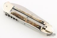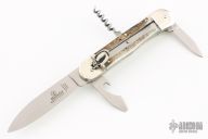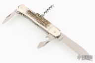 This Stag Multiblade Leverlock by Hubertus has a mirror polished blade, a mirror polished stainless steel clip point blade with nail nick, a mirror polished bottle opener/ flat head screwdriver, cork screw. Scales are stag antler over brass liners, stainless steel back spacer(s), and nickel silver bolsters. Excellent condition. Comes with original box.