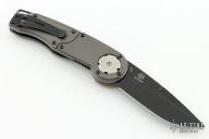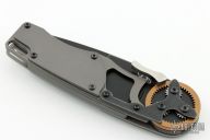 This is a knife from the GH-Series Gearhead folding knife by Mantis Knives. The "steampunk-style" Gearhead liner lock folder is equipped with a unique gear-driven pivot with one large gear, three small gears and a thumb lever used to deploy the blade when pushed down. It features a flat 3.38" plain edge tanto blade and measures just under 5" when closed. The gray handle scales are made from aluminum with a stainless steel backspacer and tip-up pocket clip. The GH2022DPBS Gearhead comes in a black stonewashed finished blade but is available in a variety of styles and finishes.