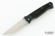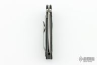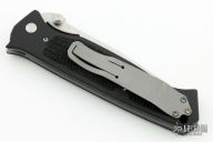 This Chameleon D/A linerlock by Butch Vallotton has a hidden push button under the rubber scale on the back side of the handle. Leaf spring action and smooth manual action. Bead blasted blade and FRN handle scales with rubber inlays, stainless steel liners. Good function, nice detent, lockup and blade seating. Numbered #220 on back side of blade. Comes with original nylon sheath. Has a couple light scuffs, otherwise great condition. The firing mechanisim is in the right scale not the side the clip is on.