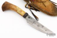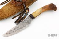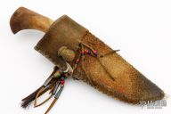 This knife by Don Bruton features a hand forged blade with hand rub satin finish, forged from a file, fileworked spine, .191" blade stock and 1.325" blade depth, hidden tang construction. The handle has a bone grip with rawhide wrap and epoxied leather wrapped guard. Comes with a rawhide leather sheath with beads. Excellent condition.