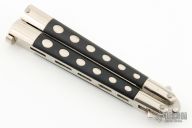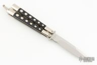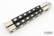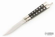 This Balisong by Benchmade features a polished Weehawk blade with false top edge. The handles are chrome plated zinc with black plastic inlays. Has some scuffs and scratches, otherwise great condition for its age. Comes with a benchmade box.