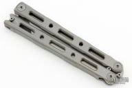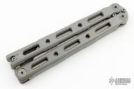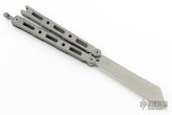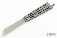 This Model 87 Balisong by Benchmade features a tumble finished wharncliffe style blade. The handle has an integrally constructed, skeletonized titanium frame with bead blast finish. Spring-loaded T latch on pommel. Comes with original box, sheath and papers. Excellent condition.