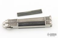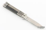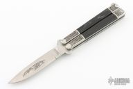 This Balisong by Parker Cutlery Company features a satin finished blade. The handles are chrome plated with buffalo horn inlays. Comes with original box. One of the scales is loose. Has a couple of light scratches, otherwise excellent condition.
