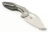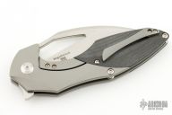 The Kizer Megatherium features a dramatic Elijah Isham design that will be a stand out in any collection. Elijah has a strong appreciation for surreal art, resulting in unique and creative knife designs that function as good as they look. This model has a modified wharncliffe blade made from CPM-S35VN steel and a titanium frame lock handle with a carbon fiber scale. The Megatherium comes equipped with Isham's "Edge Below Tab" flipper system, that conceals the flipper in the open position for unobstructed performance. Item includes a titanium tip-up pocket clip with a bead blast finish. Has some scuffs, otherwise excellent condition.