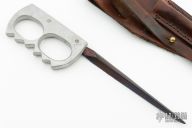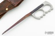 This Clements Trench Spike by Ploughshare Forge features a black triangle dagger blade that has been riveted to an aluminum knuckle grip. Comes with a brown leather sheath. Has temper colors on the blade. Has some scratches, but it is intended to look like the originals, otherwise good condition.