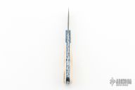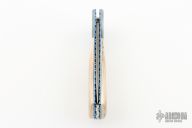 This Lockback Folder by Wayne Whittaker features a Raindrop Damascus blade with nail nick. The handle has Ladder Damascus bolsters, mammoth ivory scales, fileworked and anodized titanium liners, fileworked stainless steel backspacer. Nice blade seating. Comes with a zippered case and COA. New from maker at the Nashville Custom Knife Show 2023.
