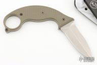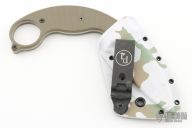 This Punch Badger by Tracker Dan features a stonewashed dagger blade with false top edge, .119" blade stock and 1.215" blade depth, full tang construction with green G-10 scales. Has an ambidextrous kydex sheath with belt clip. Excellent condition.