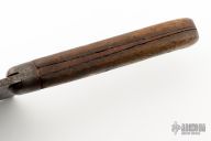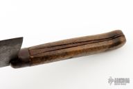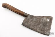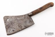 This vintage cleaver by Foster Bros features a large blade with the traditional hole at the tip, .300" blade stock and 6" blade depth, full tapered tang construction. The handle has a steel bolster and wood scales. Has oxidation and patina, otherwise good condition for its age.