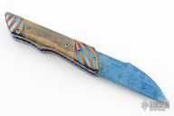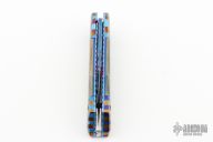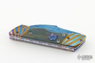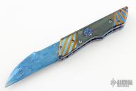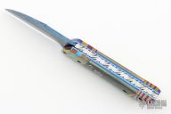 This Mantis Auto by Kyle Vallotton features a Cheetah Damascus blade with false top edge. The handle has candy stripe timascus bolsters, mammoth ivory scales, Damascus push button, fileworked and anodized titanium liners, fileworked stainless steel backspacer. Nice lockup, action and blade seating. Comes with zippered case and COA. Excellent condition.