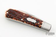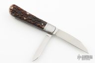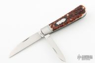 This two-blade swayback from Ryuichi Kawamura features two hand rub satin finished blades with Ryu's mirror polished ricassos and swedges, both have nail nicks. Both have half-stops. Spring is flush in all positions. The handle has threaded stainless steel bolsters, stainless steel liners and springs and stag covers. This is a gorgeous example of Ryuichi's talent/craftsmanship. Includes a padded zippered case.  Excellent Condition.