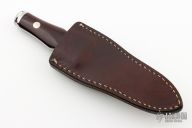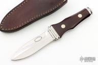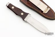This is a very attractive boot knife from AG Russell. This is the older model made in Solingen, Germany. The mirror polished double edged blade is .099" thick and .908" deep at the ricasso and double-edged. Scales are maroon linen micarta. Integral construction with aluminum pins. Comes with a brown leather sheath. Excellent condition.