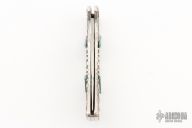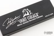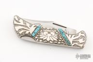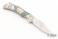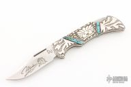 This "Spirit Stalker" folder is a David Yellowhorse Premier Edition by United Cutlery. It features a satin finished clip point blade with swedge and nail nick. The blade is marked with his signature and logo. The handle has a carved sterling silver with turquoise inlays over a steel lock back. Numbered 1542/2500. Includes original box and COA. Excellent condition.