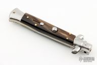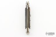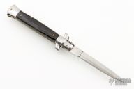 This Swivel Bolster from Stiletto Italy features a dagger ground blade with false top edge. The handle is comprised of stainless steel bolsters and pommel with buffalo horn scales over brass liners and stainless steel backspacer. Has been resharpened, otherwise good condition.