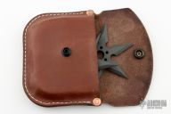 Set of three throwing stars from the Gold Point Forge, of Ryan Johnson. They feature five, 1.25" milled blades, .20" bladestock, .625" blade depth, with a cerekote finish. 4" inches in diameter. Comes with a molded leather sheath. New from maker!