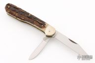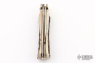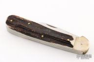 This knife by Hubertus is unique, it features two satin finished blades. The larger blade is an auto and is fired by pressing down on the back of the small blade. The handle has nickel silver bolsters, stag scales, brass liners and steel springs. Has some light scuffs and scratches, great condition otherwise.