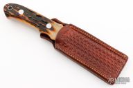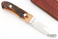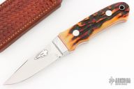 This Loveless New York Speical by Gary Martindale features a mirror polished blade with a 1.5" sharpened top edge, full tapered tang construction with .185" blade stock and .891" blade depth. The handle has a mirror polished stainless steel guard, amber stag scales with red liners, and a lanyard hole at the butt. Includes a hand tooled brown leather sheath. #3 on the blade. Gary's knives are amazing, and this one is no exception. Excellent/new condition.