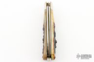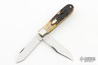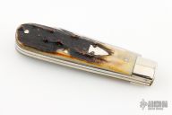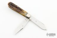 This Barlow from Northwoods Knives features a mirror polished blades with nail nicks. The handle has nickel silver bolsters, stag covers, brass liners and stainless steel springs. Has half-stops. Has a few light scratches and some pitting marks on the blade, otherwise good condition.
