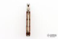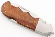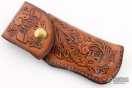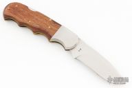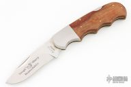 This lockback by Rhino features a mirror polished blade with nail nick and notched thumbrest. The handle has stainless steel bolsters, dymondwood scales and brass liners and stainless steel backspacer. Comes with a hand tooled brown leather sheath. Has a few light scratches, otherwise excellent condition.