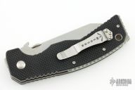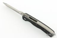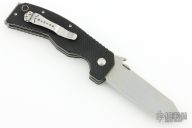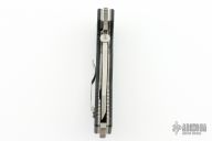 This XHD-HMMVK-SF by Emerson Knives features a satin and stonewashed chisel ground blade with thumbdisc, wave feature and notched thumbrest. The handle has textured black G-10 scales, tumbled titanium liners and notched backspacer, lanyard hole, tip up reversible stainless steel clip, stainless steel lockface insert. Rides on bearings, nice detent, lockup and blade seating. Comes with Emerson box and papers. #0113 on blade. Excellent condition.