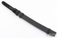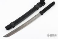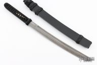 This Wakizashi from Master Smith Wally Hayes features a tanto blade with sharpened top edge, a nice double hamon, .231" blade stock and 1.258" blade depth, hidden tang construction. The handle has stingray skin under a Turk's head cord bolster and flat black cord wrap, has a silver menuki. Comes with a kydex sheath with wood welt/core and a belt loop. Has some light scratches, otherwise excellent condition.