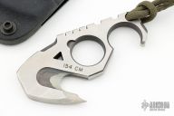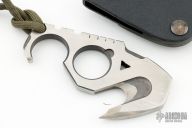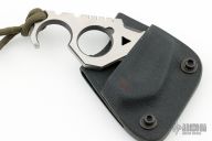 The Gutrench operates on a pivot ring theory. Once you enter the piercing tip into the game you are about to clean, simply pull rear ring with second finger. This upward pull in the rear forces the cutting edge to align with the target area, and also forces the rolled nose downward pushing away internal organs that could possibly be ruptured during the opening phase of a field dress. .253" blade stock. Comes with a kydex sheath. Has some light scratches, otherwise excellent condition.