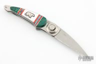 This Paul Perfecto from Lone Wolf Knives features a bead blast wharncliffe style blade. The handle has a stainless steel frame and barrel spacers. Pivot features the Paul Axial Locking Mechanism. Includes a padded zippered case.  Light scuffs and scratches are visible on the knife otherwise it is in excllent condition.