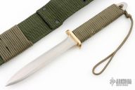 This PB-4 by EK Knives features a satin finished double edged blade with .147" blade stock and 1.105" blade depth, full tang construction. The handle has a brass guard and green paracord wrapped handle. Comes with nylon sheath. Has a few light scratches, otherwise excellent condition.