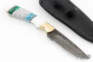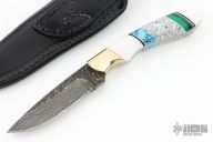 This Hunter by Kelgin features a Damascus blade with .171" blade stock and .759" blade depth, full tang construction. The handle has brass bolsters, multi-color scales. Comes with a black leather sheath and COA. Excellent condition.