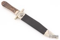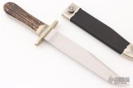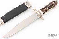 This English Bowie by Mamoru Shigeno features a hand rub satin finished blade with false top edge, .224" blade stock and 1.252" blade depth, hidden/frame tang construction. The handle has an engraved nickel guard, collar and frame, stag scales and a nickel silver finial. Comes with an engraved nickel silver and black leather scabbard. Comes with a zippered case. Excellent condition.