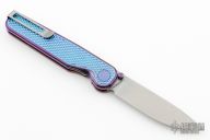 The Rockwall by Tactile Knife features a stonewashed Magnacut blade with notched thumbrest and dual thumbstuds. The handle has a milled and anodized titanium frame with a tip up stainless steel clip and backspacer. Comes with original box and papers. Excellent condition.