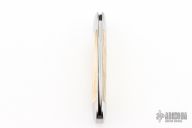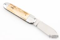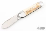 This Sleevboard Prototype by Mike Rothman features a hand rub satin finished blade with nail nick. The handle has mirror polished 416 stainless steel bolsters with integral liners, mammoth ivory covers with a stainless steel arrow escutcheon, jeweled liners, and a CPM154 spring. Has half-stop, flush in all positions. Comes with zippered case and COA. New from maker!