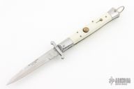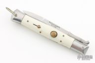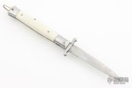 This Swing Guard Stiletto Auto has a satin polished stainless steel spear point blade with false top edge. The handle has white acrylic scales with stainless steel bolsters and liners, nickel silver auto button and safety button, and brass bail. Has scratches and scuffs, has some blade play, the tip is exposed when it is closed, fair condition.