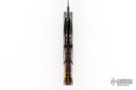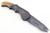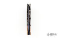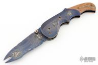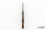 This Beautiful Linerlock Folder has a "Vampire" pattern mosaic Damascus (15N20 & 1084, by Mastersmith Wade Colter) clip/ spear point blade with single, fileworked thumbstud. Scales are exhibition grade mammoth ivory bark, over anodized and filed titanium spacers, fileworked stainless steel backspacer (including underside), and fileworked brass fittings. This is a work of art. Fit, finish, and materials used are incredible. This is a lot of knife in a little package. Comes with padded zipper case. Excellent condition.