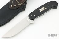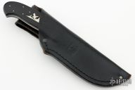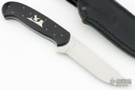 This knife by Brian Yellowhorse features a mirror polished blade with fileworked spine and engraved flats, .162" blade stock and .969" blade depth, full tapered tang construction. The handle has black scales with engraved nickel silver inlays and nickel silver pins. Comes with a black leather BUCK sheath. #6/25. Excellent condition.
