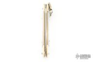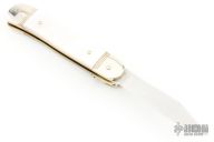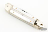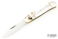 This Lever Lock Automatic by Hubertus Knives features a polished clip point blade with nail nick. The handle is comprised of nickel silver double bolster and lever with mother of pearl scales over brass liners and steel backspacer. Has some light scratches and patina, otherwise excellent condition.
