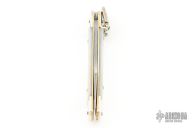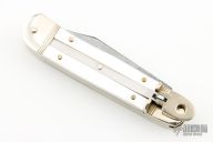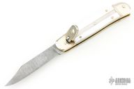 This Lever Lock Automatic by Hubertus Knives features a Damascus clip point blade with nail nick. The handle is comprised of nickel silver double bolster and lever with mother of pearl scales over brass liners and steel backspacer. Has some light scratches and patina, otherwise excellent condition.
