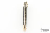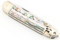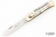 This Lever Lock Automatic by Hubertus Knives features a drop point blade with nail nick and file worked blade spine. The handle is comprised of nickel silver double bolster and lever with abalone scales over file worked brass liners and steel backspacer. Has some light scratches and patina, otherwise excellent condition.