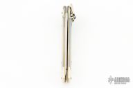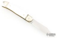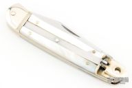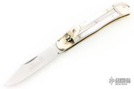 This Lever Lock Automatic by Hubertus Knives features a clip point blade with nail nick. The handle is comprised of nickel silver double bolster and lever with mother of pearl scales over brass liners and steel backspacer. Has some light scratches and patina, otherwise excellent condition.