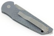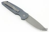 This TR-3 X1 SMKW by Pro-Tech Knives features a bead blasted spear point blade. The handle has a gray aluminum handle with stainless steel backspacer with lanyard hole, tip up blade stainless steel clip. Includes the original box and papers. Has a couple light scuffs, otherwise good condition.