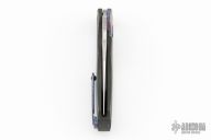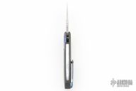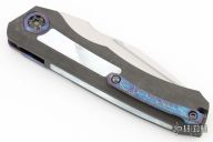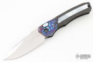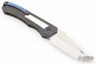 This Wraith Auto by Heretic Knives features a hand ground high polish clip point blade with false top edge and notched thumbrest. The handle has a Damtanium bolster with a polished flat and orange peel finished bevels, integral Fat Carbon Dunes handle with MOP inlays, a lightning anodized tip up titanium clip, and lanyard hole at the butt.  Comes with original box and COA dated 11/22 #013. Excellent Condition.