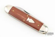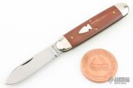 This slipjoint from Northwoods Knives features a satin finished blade with swedge and nail nick. The handle has nickel silver bolsters with camel bone covers and over brass liners and stainless steel spring. Includes a brown leather sheath and challenge coin.  Excellent Condition.